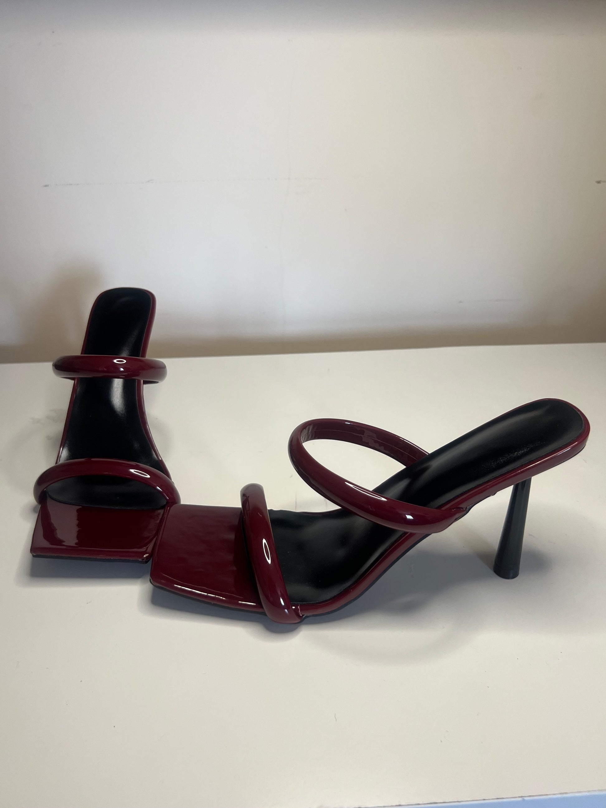 Rich patent burgundy square-toe mules with two wide, rounded straps. A simple, elegant, and slightly flared black heel.