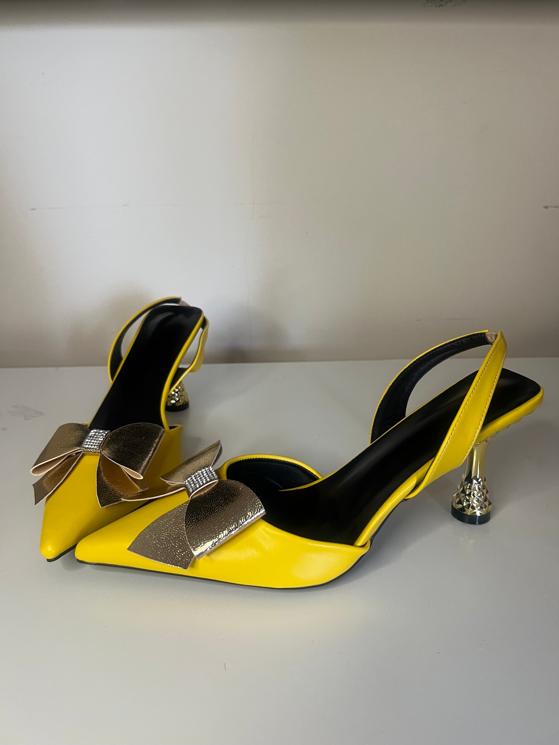 Bright yellow slingback heels with a large, shiny gold and diamante embellished bow, and a sculpted clear/gold heel.